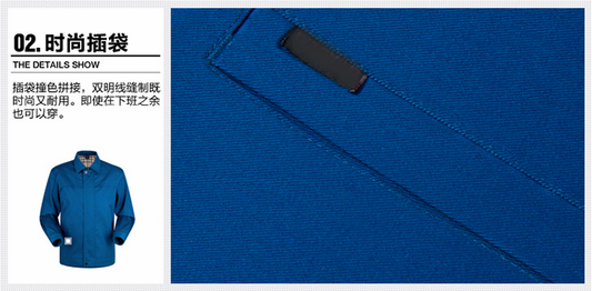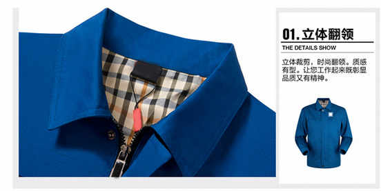 JL-QD217東莞廠服以寶藍(lán)色純色為主色,領(lǐng)口采用立體式翻領(lǐng),外側(cè)插兜線條感十足,甄選高品質(zhì)面料,讓您穿著舒服,時尚