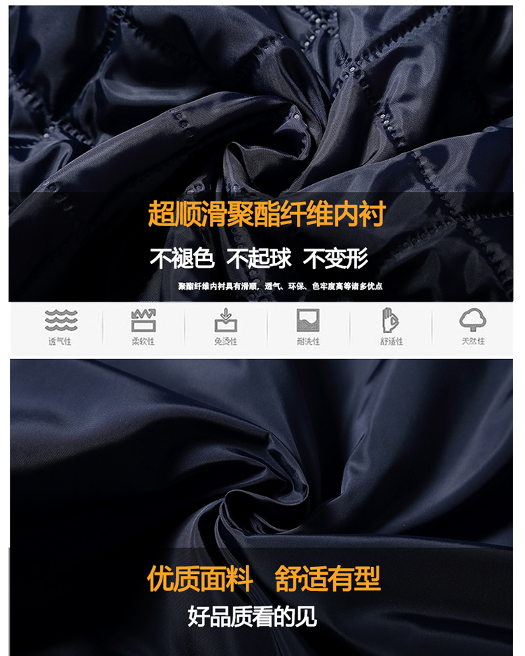 采用超順滑聚酯纖維內襯,內膽加棉,不起球,不褪色,不變形。防靜電內襯,為冬天起到更實用的穿著